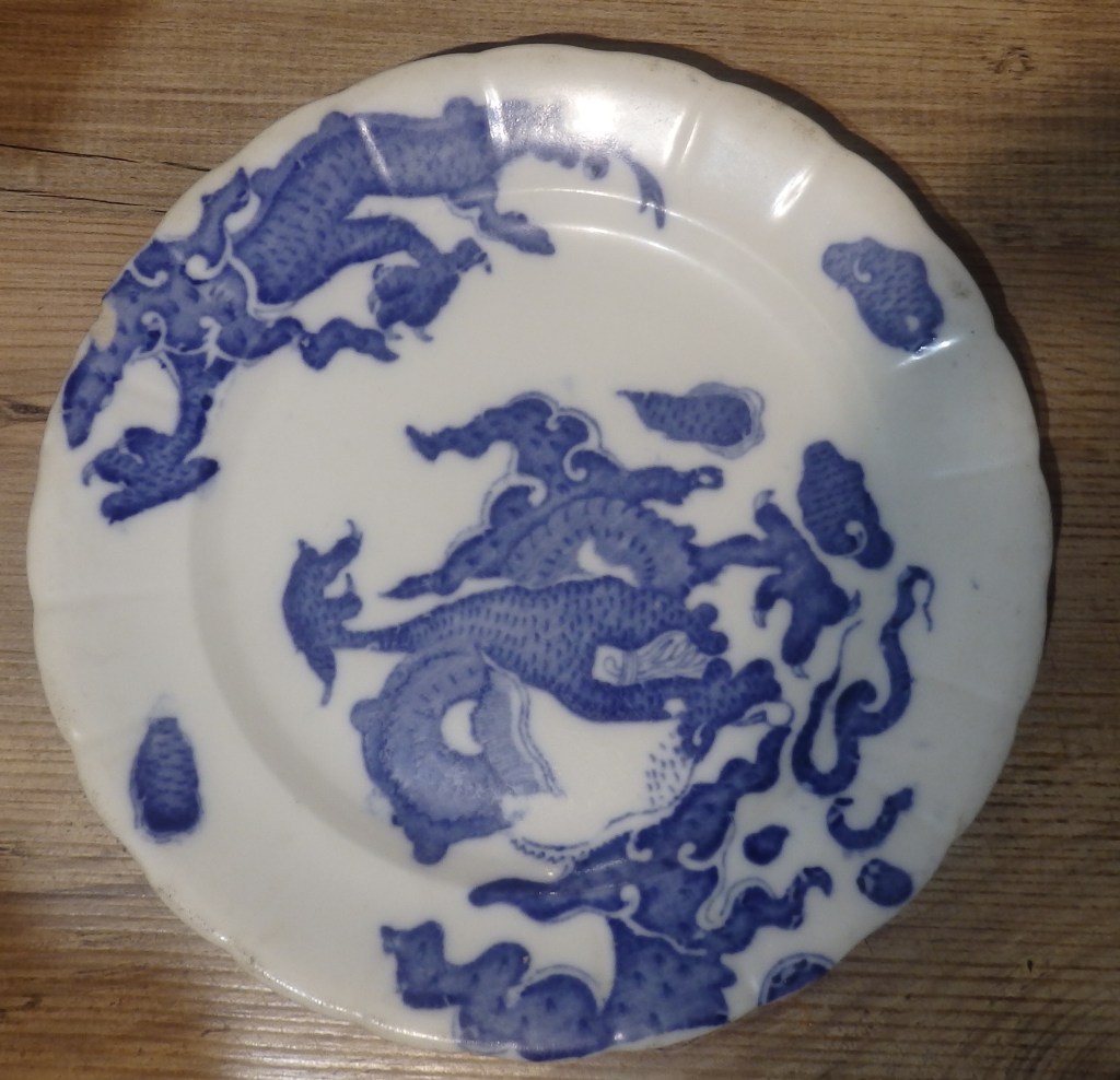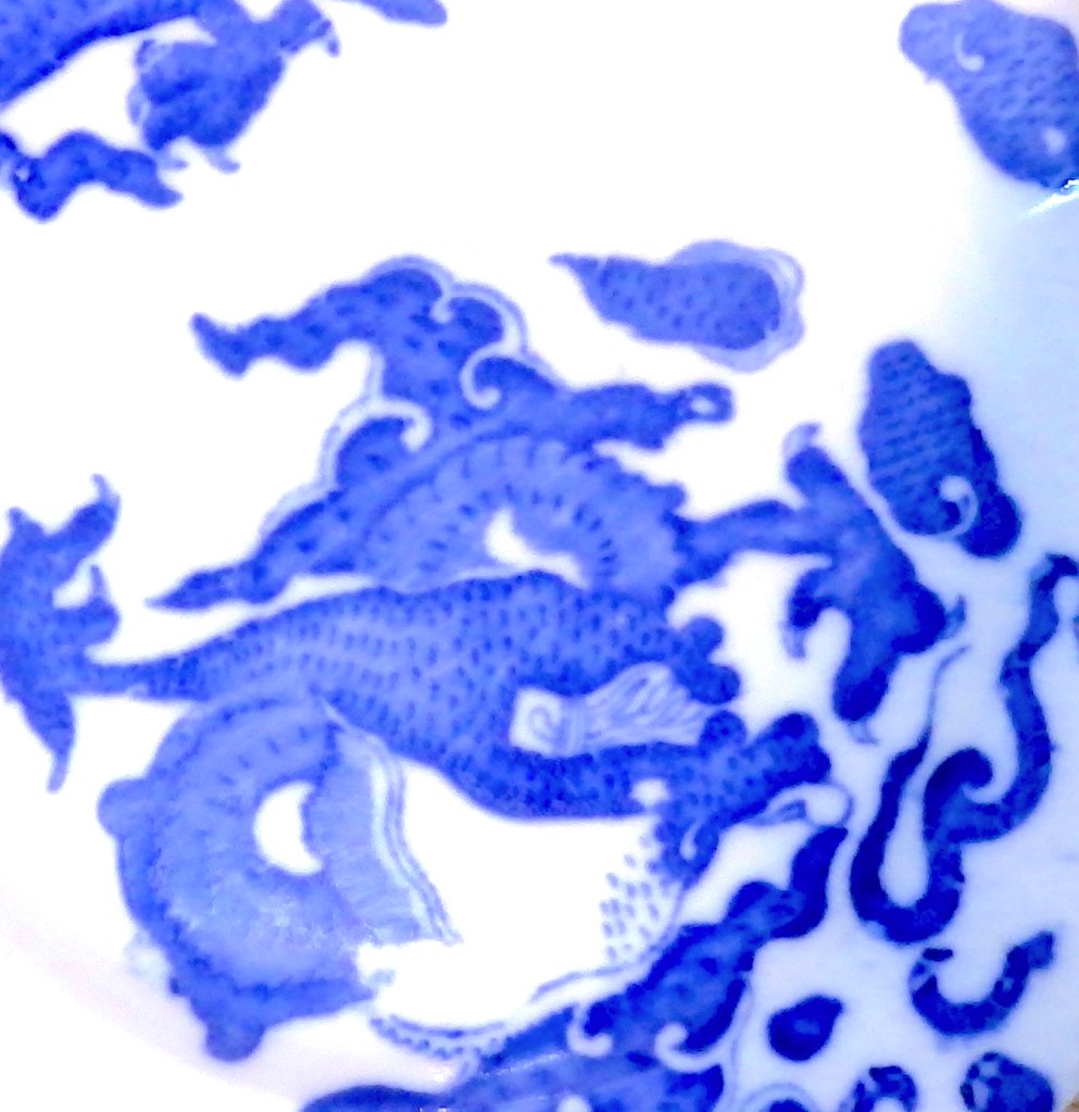 Mae’r platiau’n darlunio chwedl Tsieineaidd: mae'r ddraig ddi-ben-draw sy'n mynd ar drywydd y ‘Flaming Pearl’. Dyma enghraifft Tsieineaidd o'r llinach Kangxi: ddraig hyfryd - gyda phen! - yn ymestyn allan am y perl.