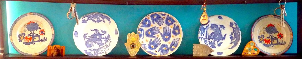 Mae’r platiau ar y dresel yn bwysig i fi. Roedd y plât modern gyda’r patrwm o ddwylo bach yn un o fy anrhegion ymddeol. Daeth y platiau glas a melyngoch o sêl cist car. Daeth y platiau gyda’r patrwm draig las o fy mam-gu.