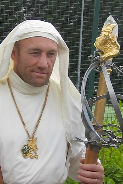 Wel, mae symbolau a regalia'r Orsedd yn arbennig yn eu rhinwedd eu hunain, ond, yn y llun hwn, mae Ceidwad y Cledd yn gwisgo gemwaith bling sy'n edrych 'lot fel draig a pherl.